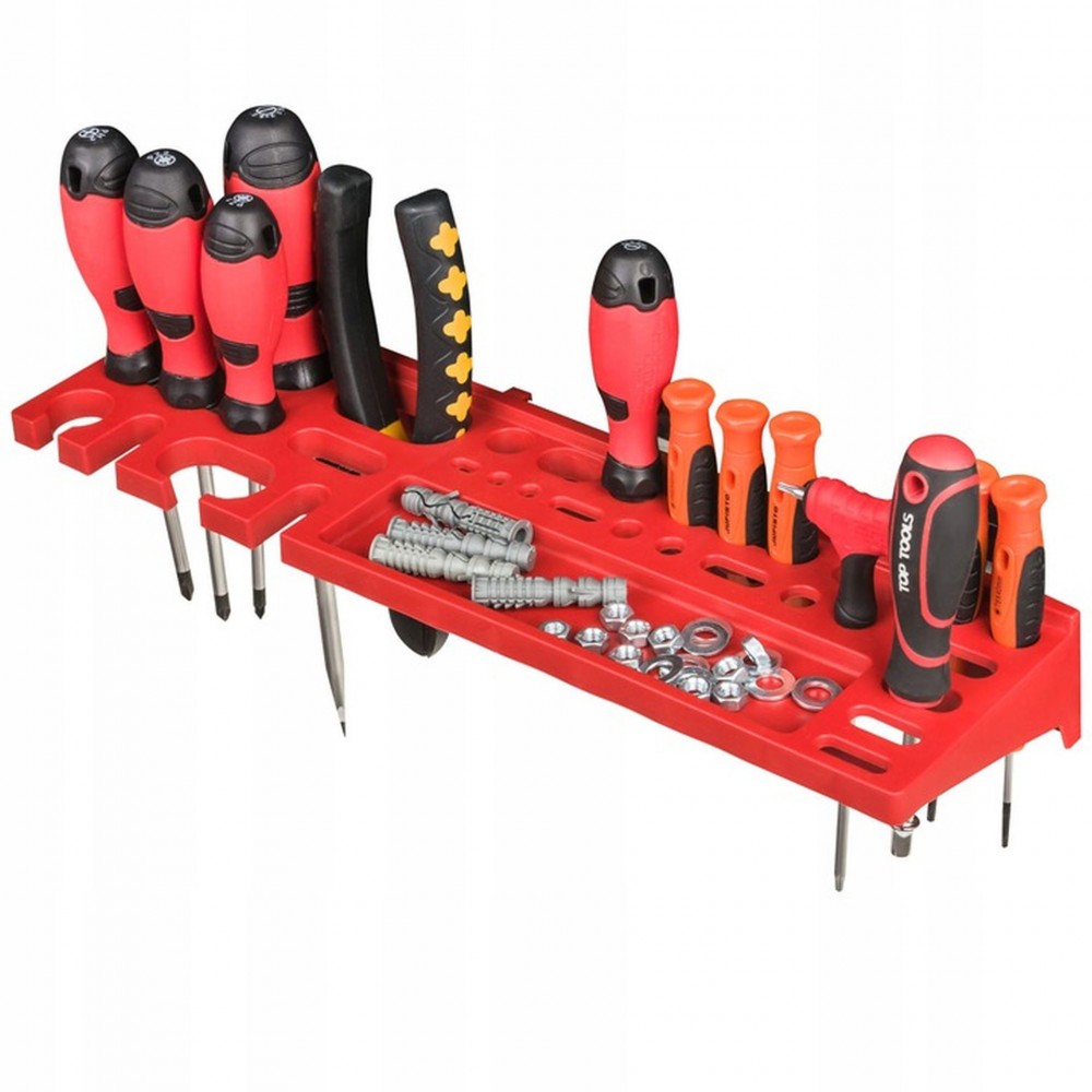 Bardzo praktyczna i duża półka na śrubokręty, młotek, kombinerki, wiertła i bity oraz wiele innych pozwolą umieścić niezbędne narzędzia pod ręką i w uporządkowany sposób. Połka, wykonana z dobrej jakości tworzywa sztucznego, jest długa i umożliwia uporządkowanie sporej ilości narzędzi. Półka stanowi znakomite uzupełnienie tablic narzędziowych, ale może być wykorzystana jako samodzielny produkt zamocowany bezpośrednio na ścianie. Dzięki takiemu rozwiązaniu uporządkujesz przestrzeń w garażu czy warsztacie.
