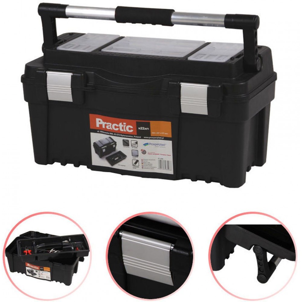 PROSPERPLAST PRACTIC Plastikowa walizka narzędziowa czarna, 550 x 267 x 277 mm N22AFISkrzynia wykonana jest z wysokiej jakości tworzywa sztucznego, które charakteryzuje się wysoką wytrzymałością i odpornością na uszkodzenia mechaniczne. Wzmocniony, aluminiowy uchwyt, zamontowany na całej długości tułowia, pozwala na bezproblemową transmisję i zapobiega przesuwaniu się dłoni. Skrzynka jest zamykana dwoma klipsami, aby uniemożliwić otwarcie podczas transportu.
