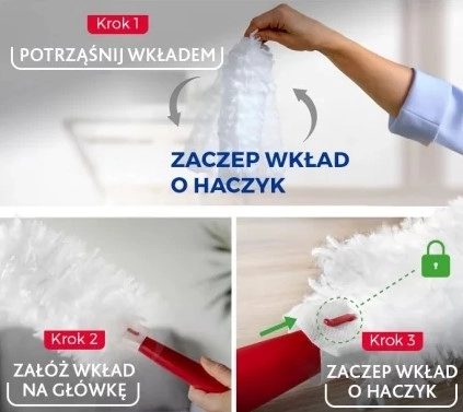 Zrównoważone sprzątanie możliwe jest dzięki wkładom z włóknami wykonanymi z materiału w 100% z recyklingu*, które podnoszą jakość sprzątania i wspierają ochronę planety. Konstrukcja 360 – włókna dookoła wkładu gwarantują, że kurz znika z każdej strony, a wbudowany haczyk utrzymuje wkład na miejscu.